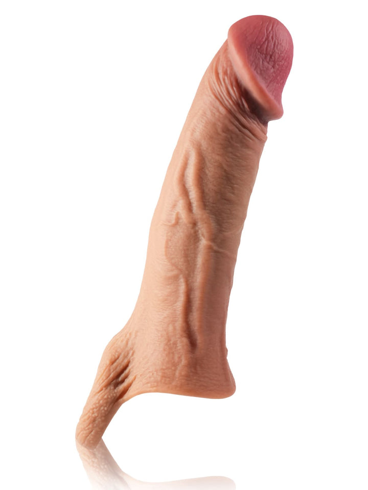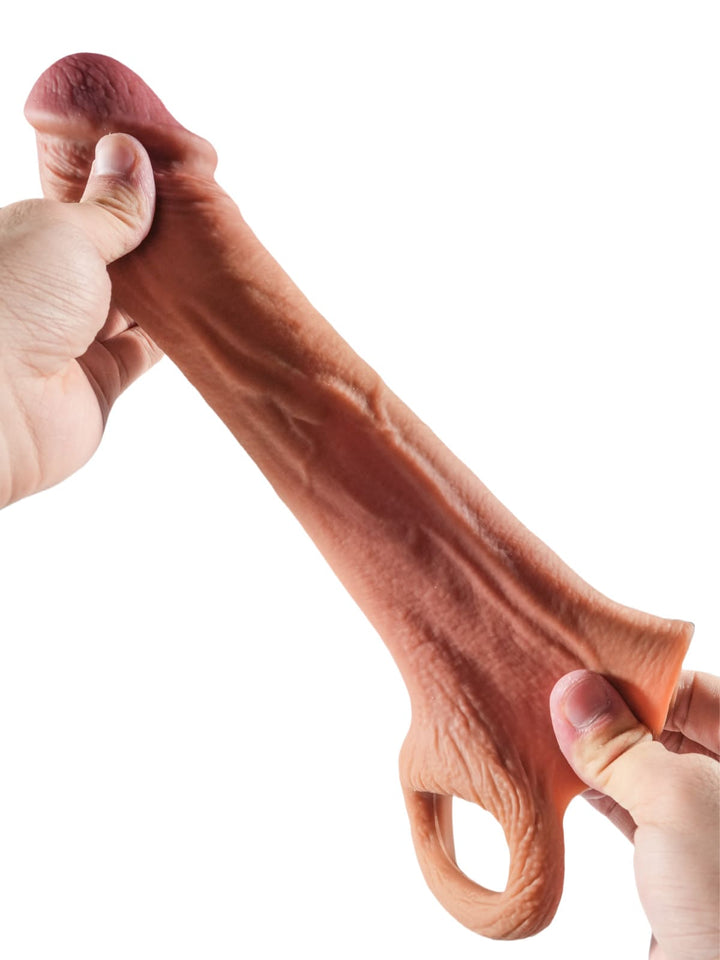 Enhance intimacy with this expertly designed penis sleeve, crafted from soft, flexible silicone for comfortable wear. Measuring 8” in length and 5.9” in girth, it fits medium to large sizes and features a soft glans that minimizes discomfort and helps delay ejaculation. The ejaculatory hole ensures a natural experience while providing extra stimulation for both partners, elevating pleasure and confidence during intimate moments.